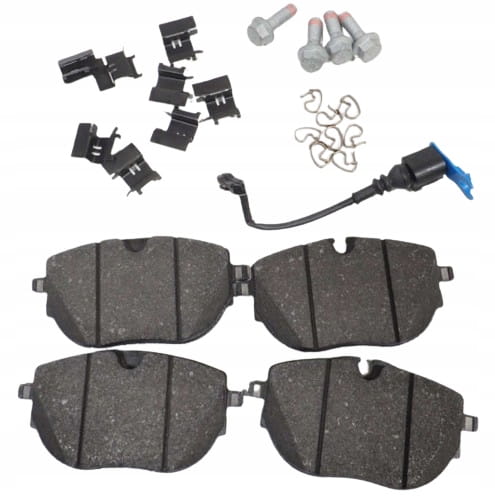 W zestawie znajduje się: 2 x klocek hamulcowy zewnętrzny, 2 x klocek hamulcowy wewnętrzny, 1 x czujnik zużycia klocków, 8 x prowadzenie, 8 x sprężyna, 4 x śruba z łbem sześciokątnym