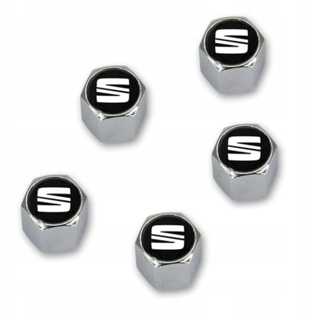 Jeden zestaw składający się z 5 aluminiowych nakładek w kolorze srebrnym z chromowym, błyszczącym logiem SEAT