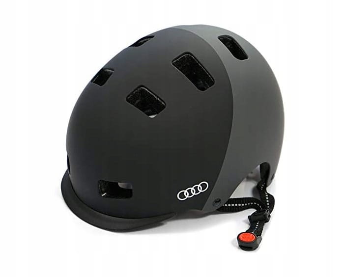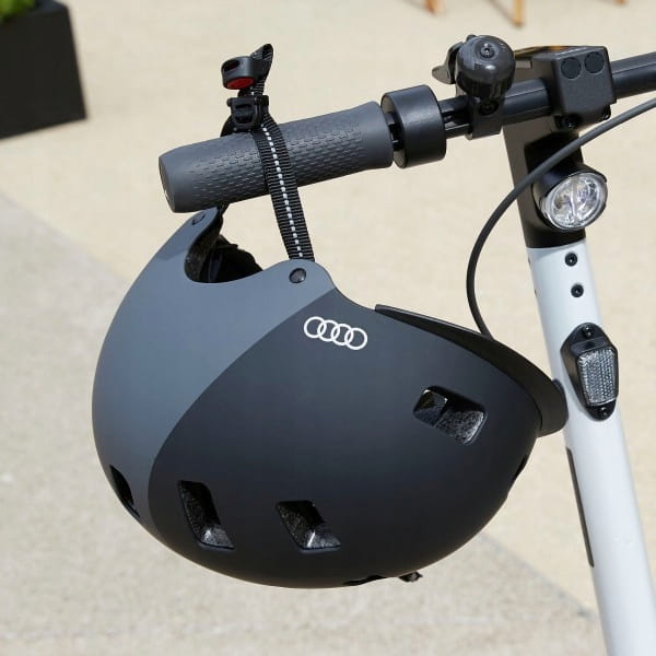 Oryginalny projekt marki Audi połączony z funkcjonalnymi cechami produktu, które mogą pomóc chronić głowę kierowcy przed urazami podczas korzystania z hulajnogi elektrycznej Audi lub innych skuterów lub rowerów. Kask składa się z wytrzymałej, natryskowej powłoki zewnętrznej i wewnętrznej powłoki w technologii twardej skorupy. Oznacza to, że strona zewnętrzna jest bardzo odporna na uderzenia, a strona wewnętrzna amortyzuje wstrząsy i izoluje przed zimnem.