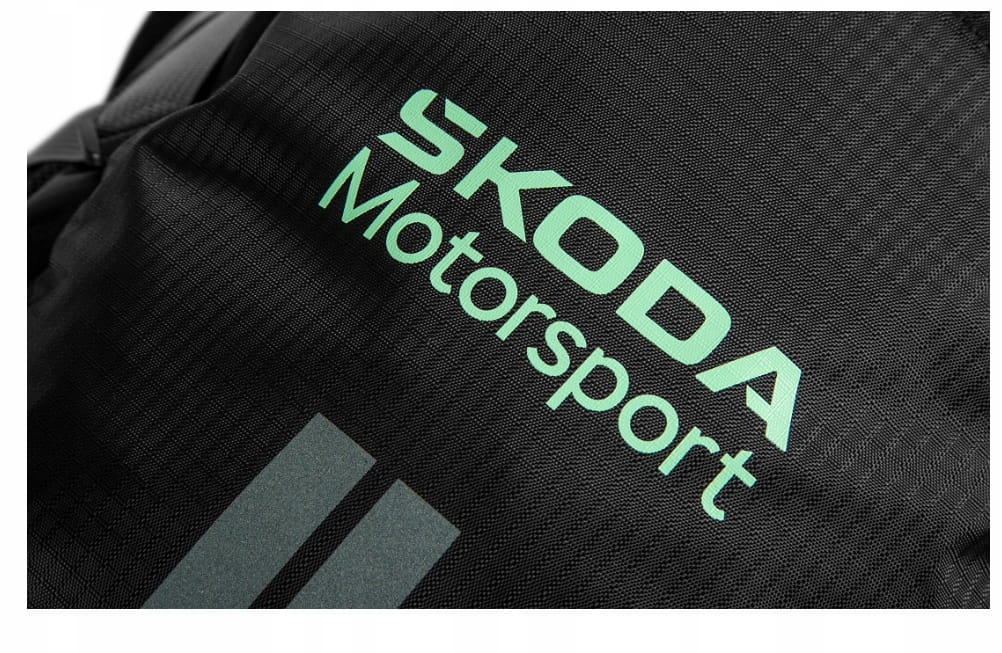 Plecak Motorsport z 2 komorami, 2 siatkowymi kieszeniami bocznymi, regulowanymi szelkami z paskiem odblaskowym, systemem pleców zapewniającym wygodne noszenie, wewnętrzne kieszenie w obu komorach, paskiem na klatkę piersiową z gwizdkiem alarmowym, płaszczem przeciwdeszczowym w kolorze elektrycznym zielonym. Znakowanie: Škoda Motorsport w kolorze elektrycznym zielonym i odblaskowym paskiem z przodu.